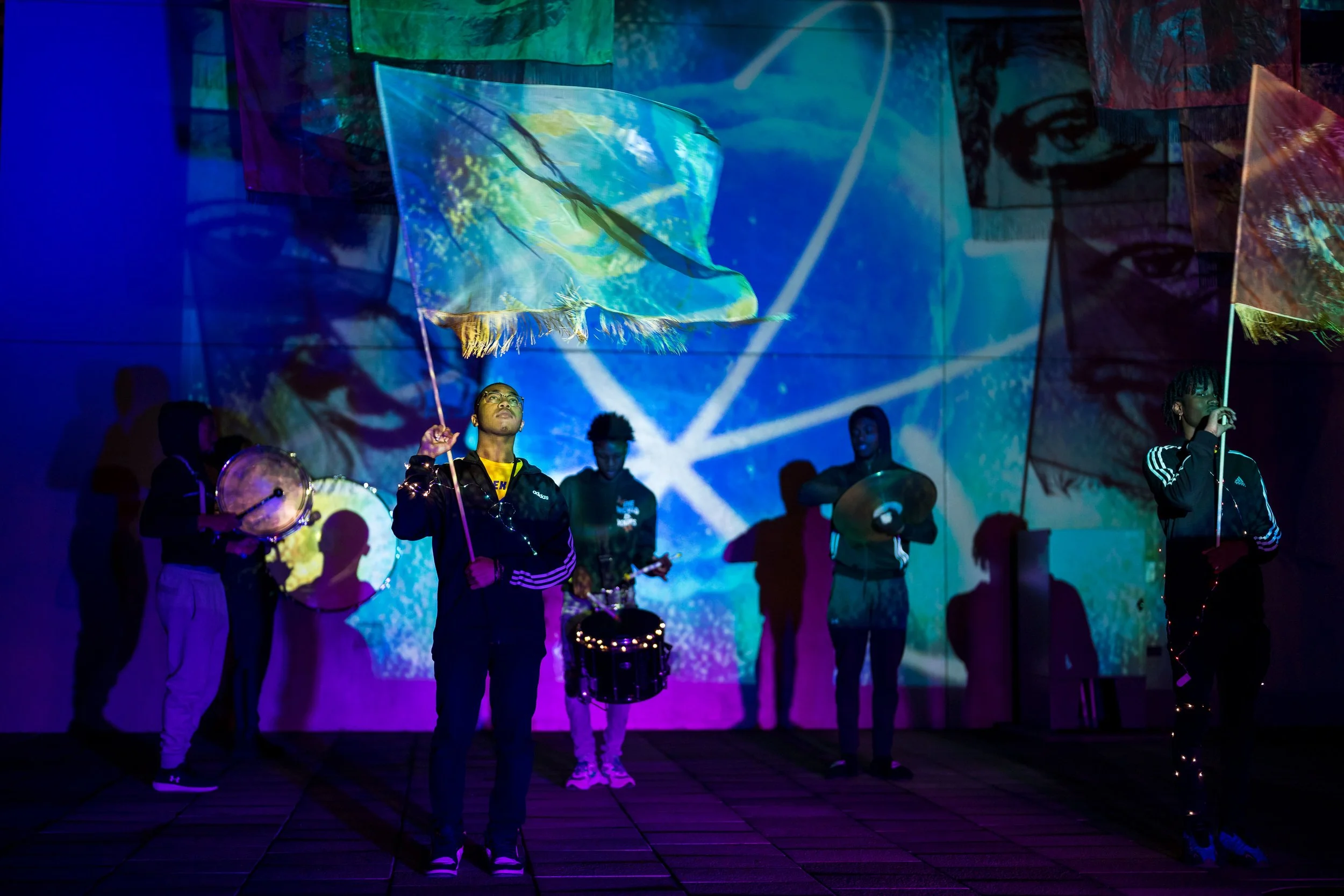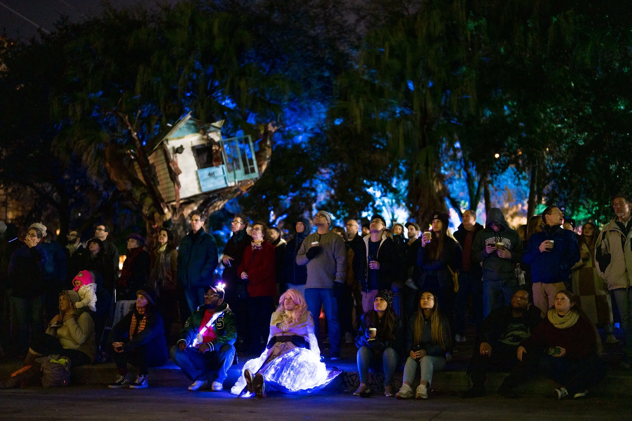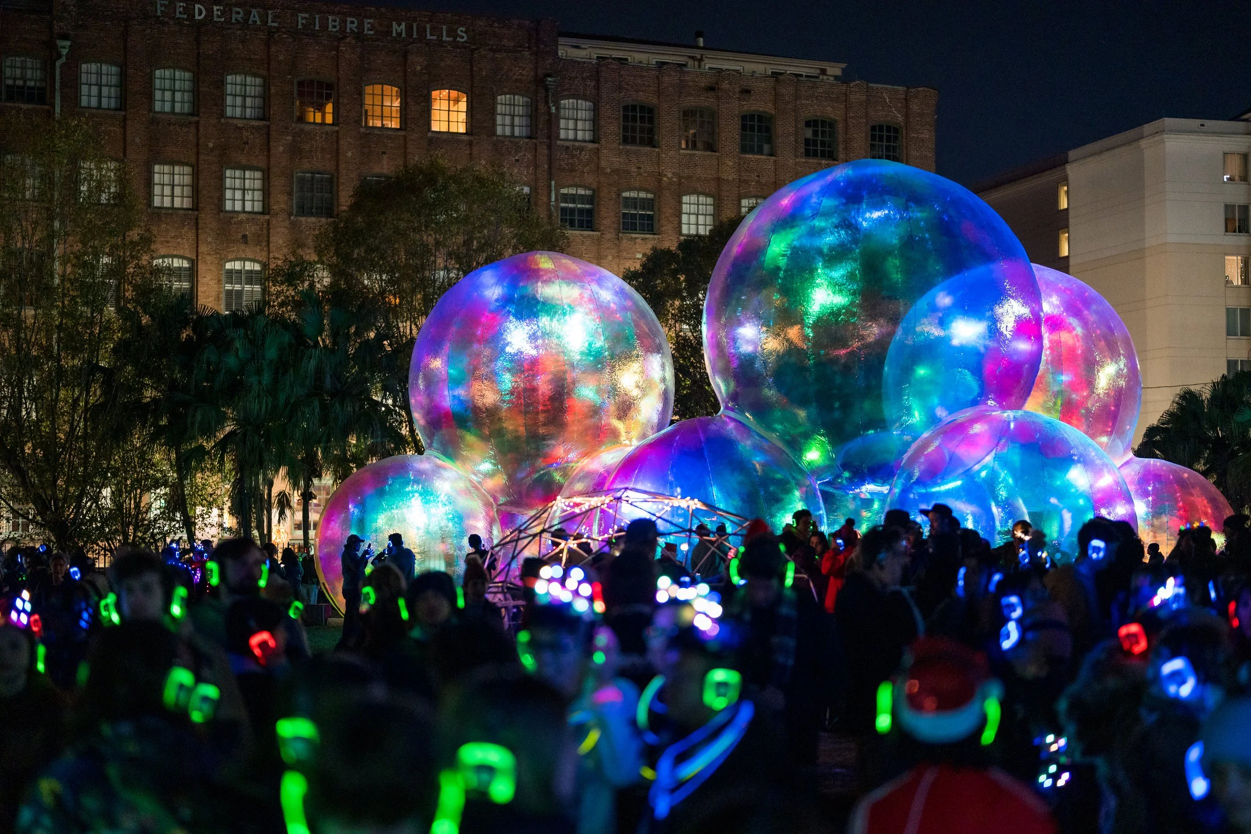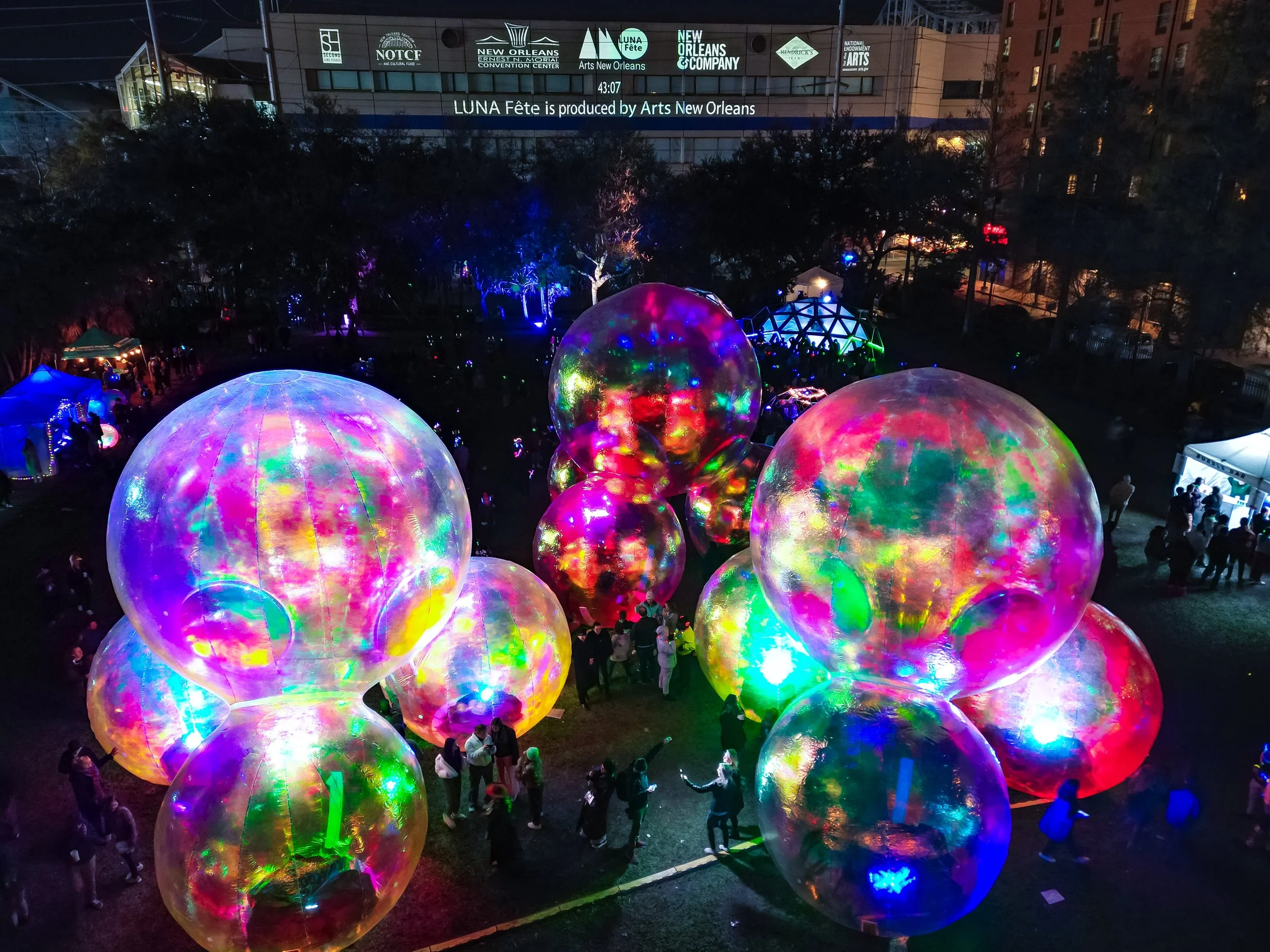 With a theme celebrating New Orleans culture bearers, “Wild Creation” honored New Orleans history of costuming culture with lighted installations from glowing and projected Black Masking Indian suits, illuminated folk tales, and gleaming symbols of transformation from lighted flowers and butterflies to giant glowing bubbles resembling oversized Mardi Gras beads.