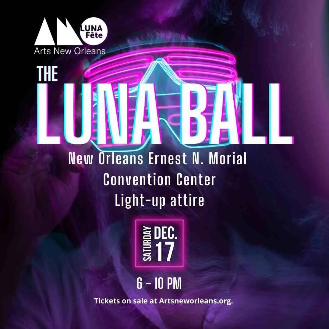 Come get lit at Arts New Orleans' inaugural fundraising event, The LUNA Ball, on Saturday, December 17, from 6 - 10 PM, at the Ernest N. Morial Convention Center. The LUNA Ball is a glowing oasis within the LUNA Fête festival grounds where guests will enjoy drinks, food, entertainment, and exclusive artwork.